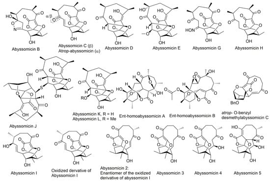 Natural abyssomicins derive from actinobacteria of either the genus Verrucosispora (abyssomicins B−L) [,] or the genus Streptomyces (abyssomicin E, I, 2–5, ent-homoabyssomicins A and B) [,,,]. Atrop-abyssomicin C, followed by abyssomicin B, seem to be the main products of fermentation of the marine-derived Verrucosispora AB-18-032, whereas abyssomicins C, D, G, and H are minor congeners [,,]. Abyssomicins B–D, J–L, and atrop-abyssomicin C are co-metabolites of fermentation of the Verrucosispora MS100128 strain []. On the other hand, abyssomicin E, abyssomicin I, ent-homoabyssomicins A and B, abyssomicins 2–5, M–X, and neoabyssomicins A–C derive from different Streptomyces strains (HKI0381, CHI39, Ank210, RLUS1487, LC-6-2, and SCSIO 5802, respectively) [,,,,,].