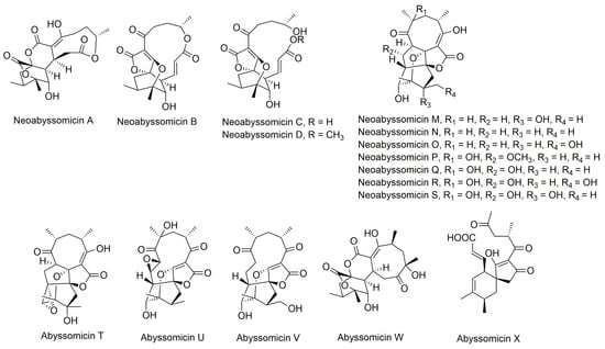 Structures of abyssomicins B–E, G–L, M–X, 2–5, atrop-abyssomicin C, ent-homoabyssomicin A and B, atrop-o-benzyl-desmethylabyssomicin C, the oxidized derivative of abyssomicin I, and neoabyssomicins A–D (modified from [,,,,,,,]). Abyssomicin 2 is the enantiomer of the oxidized derivative of abyssomicin I. Abyssomicin X is the first reported naturally occurring linear abyssomicin.