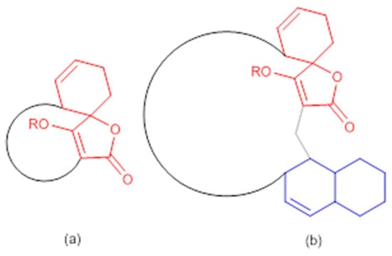 General structures of spirotetronate polyketides (a) Class I and (b) Class II (modified from []). In red: spirotetronate moiety; in blue: decalin moiety.