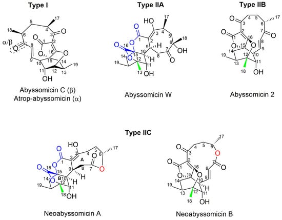 Representative chemical structures of each type and subtype of the abyssomicin class of natural products: type I (abyssomicin C and atrop-abyssomicin C), type IIA (abyssomicin W), type IIB (abyssomicin 2), and type IIC (neoabyssomicin A and B) (modified from []).