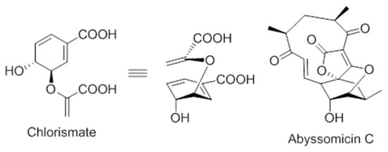 On the structural basis, the oxabicyclooxane ring system of abyssomicin C and atrop-abyssomicin C show striking similarity to the chorismate transition state analogue (Figure 6), suggesting, therefore, that these compounds are substrate mimetics [].