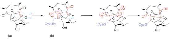Abyssomicins possess an intriguing molecular assembly by virtue of their unique combination of structural motifs. They are class I spirotetronate-polyketides []. Common structures of this class of compounds include an oxabicyclooctane system (four interwoven ring cycles), an 11-membered ring carrying an α,β-unsaturated ketone (or a hydroxyl in the case of abyssomicin B and I), and a tetronate moiety (Figure 11) []. The α,β-unsaturated ketones function adjacent to their oxabicyclooctane ring, and along with a trans-configured olefin, form a Michael acceptor system, located at C7–C9, that is essential to exert antimicrobial activity (Figure 11). Missing activities of abyssomicin B, D, E, G, H, I, K, L, M–X, ent-homoabyssomicin A and B, due to the reduction of the alkene to the corresponding alkane at C8–C9 (abyssomicin B, D, E, G, H, K, L, M–X, ent-homoabyssomicin A, B, neaoabyssomicin A), and the reduction of the ketone in C7 to a hydroxyl (abyssomicin B and I), destroys the Michael acceptor enone moiety. This further validates the importance of an intact Michael acceptor system as a SAR requirement for abyssomicins [,,,,,]. This intact Michael acceptor system is thought to be involved not only in the mechanism of action of active abyssomicins but also in the biotransformation and biosynthesis of the members of this family, as described previously (Section 6). Moreover, missing activities of the linear abyssomicin X, emphasize the role of cyclic structure in conferring both activity and toxicity [], while missing activity of neoabyssomicins A–C emphasizes the role of an intact 11-membered ring in conferring antimicrobial activity [].
