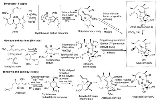 To date, two successful total synthesis of abyssomicin C have been reported, the first by Sorensen and coworkers, and the second by Nicolaou and Harrisson (Table 1, Figure 8) [,,,,]. Furthermore, numerous attempts have been reported, such as those of Couladouros and coworkers, and those of Snider and Zou, which were also considered as formal syntheses [,,,,].