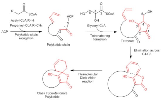 A combination of feeding studies with 13C-labelled biosynthetic precursors on cultures of Verrucosispora maris AB-18-032 were conducted, and the abyssomicin biosynthetic gene cluster of abyssomicin C was identified. Based on the findings from the aforementioned studies, the atrop-abyssomicin biosynthesis is found to be initiated via the type I polyketide synthase pathway [] as a linear polyketide chain is formed (from five acetates, two propionates, and a metabolite from the glycolytic pathway) (Figure 9) [,,]. The construction of the polyketide chain starts by condensation of acetic acid units, and proceeds by elongating their carbon chain via attachment of acetyl and/or propanoyl units (abyB1, abyB2, and abyB3) to the acyl carrier protein (ACP) (abyA3) by the acyl transferase (abyA2). The polyketide synthase processing is followed by the formation of tetronate by incorporation of a glyceryl unit, via glyceryl-CoA (by a Claisen condensation followed by lactonization). The tetronate formation is followed by an elimination of the hydroxy group at C5 via acetylation and subsequent elimination, thereby forming dienophile []. An intramolecular Diels–Alder reaction then generates the characteristic Class I spirotetronate polyketide moiety (Figure 10).