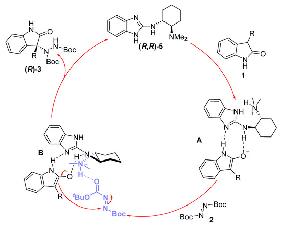 Concerning a possible reaction mechanism, there is some experimental evidence that needs to be considered before hypothesizing a possible catalytic cycle. Firstly, when comparing some optical rotation values obtained from the amination products 3 with those described previously in the literature, we could conclude that catalyst 5 possessing an (R,R)-absolute configuration produced the corresponding (R)-products. Secondly, from the results obtained in the catalyst screening, it can be deduced that the dimethylamino moiety is essential for achieving good enantioselectivities, since all the catalysts lacking such a group produced low ee values. Finally, the fact that N-Boc-protected oxindole gave rise to the amination product in high yields but as racemic mixtures (Scheme 2) led us to think there might be another type of influence besides the possible steric hindrance. With all these data in hand, we hypothesize the following catalytic cycle (Figure 3), assuming the bifunctional role of catalyst 5: Organocatalyst 5, acting firstly as a Brønsted base, through the guanidine or dimethylamino moiety, could deprotonate the 3-substituted oxindole. Once the enolate is formed, the guanidine moiety can stablish hydrogen bond interactions not only with the enolate but also with the N–H bond from the amide group of oxindole, as depicted in intermediate A. Next, the protonated dimethylamino group can activate the diazocarboxylate by another hydrogen bond interaction (intermediate B), forming a close transition state in which the enolate reacts through the Re-face, affording the corresponding (R)-amination product and releasing the catalyst.