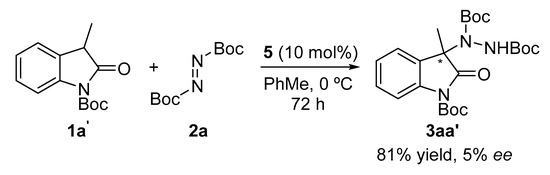 In an open-air tube at room temperature (25 °C), the corresponding 3-substituted oxindole (0.10 mmol) was added to a solution of organocatalyst 5 (10 mol %) in toluene (1 mL). After 5 min, the mixture was introduced into a cooling bath at 0 °C and after 2 min, di-tert-butylazodicarboxilate (0.11 mmol, 1.1 eq.) was added in one portion. The reaction was then allowed to react for 3 days. After this time, water (5 mL) and ethyl acetate (5 mL) were added, and the aqueous layer was then re-extracted twice (2 × 10 mL). The combined organic phases were dried (MgSO4) and evaporated under reduced pressure. Finally, the reaction crude was purified by column chromatography on silica gel or TLC preparative using hexane/ethylacetate mixtures as eluent.