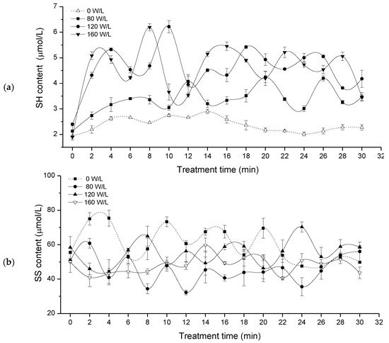 The changes of SH and SS contents during ultrasound pretreatment process. (a) SH content; (b) SS content.