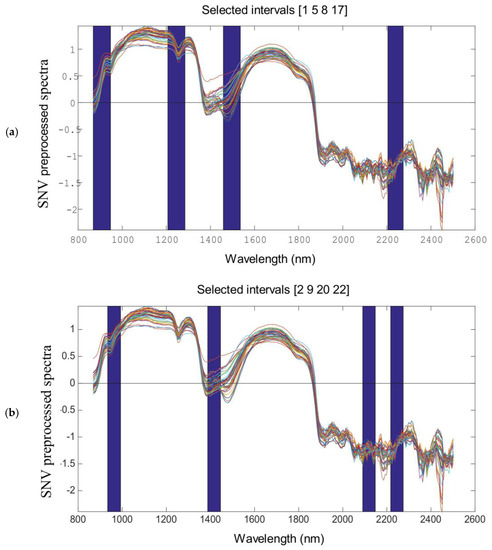 Optimal spectral regions of SH content and SS content selected by Si-PLS (a) SH content (b) SS content.