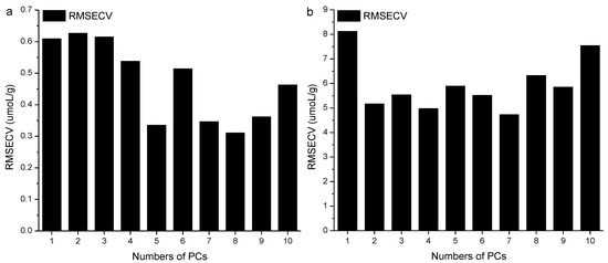 RMSECV values of BP-ANN model under different PCs of SH and SS contents. (a) SH content; (b) SS content.