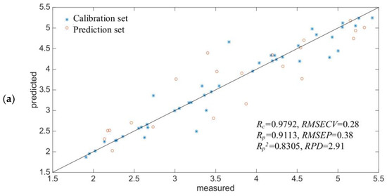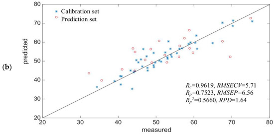 The Si-PLS model developed for SS was based on the optimal combinations of intervals, which were from information for 933–992, 1388–1446, 2091–2148 and 2217–2274 nm. The performance of the optimal model is indicated in boldface in Figure 3b. It shows a scatter plot demonstrating the correlation between the reference measurement and the in-situ spectra prediction in the calibration and prediction sets. The value of RMSECV was 6.54 µmol/g and Rc was 0.7045 in calibration set. When the performance of the Si-PLS model was evaluated with the samples in the prediction set, the value of RMSEP was 9.91 µmol/g and Rp was 0.5664 in the prediction set.