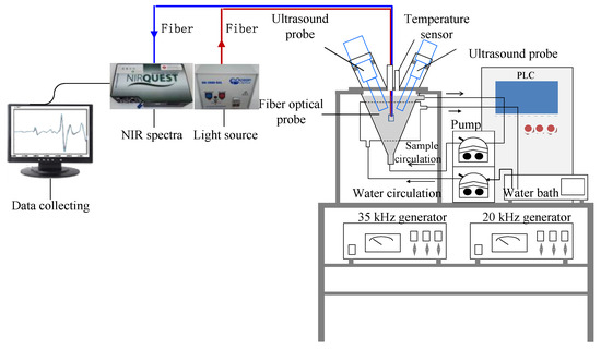 The in-situ monitoring system (Figure 6) consisted of four parts: an alternating dual-frequency ultrasound emitter (ADFU), developed by our research team and manufactured by Meibo Biotechnology Co. (Zhenjiang, Jiangsu, China), a miniature NIR fiber optic probe spectroscope (NIRQUEST256-2.5, Ocean Optics, Largo, FL, USA); a portable halogen light source (DH-2000-BAL, Ocean Optics) and a fiber optic probe (TP300, Ocean Optics).