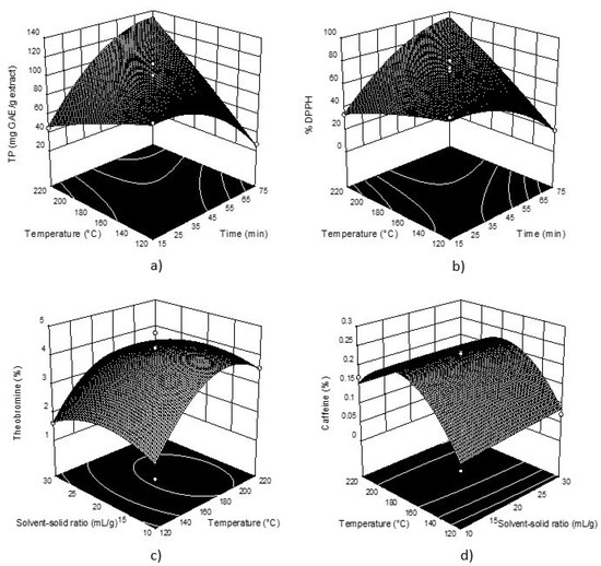 Three-dimensional plots for obtained TP (a) and DPPH (b) in cocoa shell extracts as a function of extraction temperature and time; Three-dimensional plots for for theobromine (c) and caffeine (d) as a function of extraction temperature and solid-solvent ratio respectively.