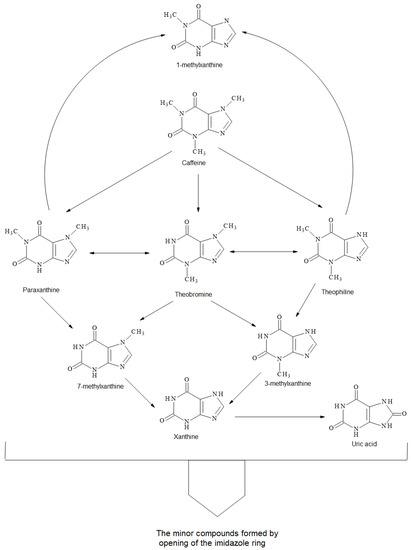 A possible degradation mechanism of methylxanthines is shown in Scheme 1 based on our results and the literature [33,34]. Caffeine can degrade into theobromine, theophylline and paraxanthine, and also into 1,3,7-methyluric acid. Simultaneously, theobromine can isomerize into theophylline and paraxanthine. Theobromine can possibly degrade into 3-methylxanthine and 7-methylxanthine, which could also be formed from paraxanthine, while 3-methylxanthine can be formed from theophylline. 1-Methylxanthine could be a product of both paraxanthine and theophylline. All these methylxanthines can form uric acids by hydroxylation. Furthermore, the opening of the imidazole rings of methylxanthines can also form other minor compounds.