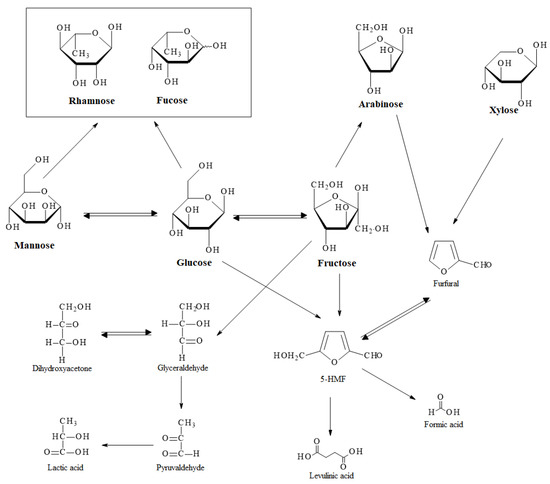Scheme 2 presents a possible mechanism for the sugar degradation which takes place when cocoa shell is hydrothermally treated, proposed based on the literature [39,40] and our results. At a temperature of 120 °C the only sugar was mannose, which isomerized into glucose at a temperature of 170 °C. Glucose probably isomerized into fructose, which further lost a −CH2O group to form arabinose. Rhamnose and fucose were probably products of mannose and glucose. It can be noticed that the sugar concentrations increased with an increase of reaction time and temperature and decreased with an increase of concentration of initial material. 5-HMF can be obtained directly from glucose or through fructose, which further formed furfural. Furfural also represents a potential product of arabinose and xylose. At a temperature of 120 °C, 5-HMF and furfural were not detected in the extract, while at 170 °C they were present in trace amounts. At a temperature of 220 °C and reaction time of 15 min, 5-HMF and furfural reached the maximal concentrations and as the reaction time was further increased their concentration decreased again. At a temperature higher than 220 °C and longer reaction times, the main products were organic acids. The detected organic acids were levulinic, lactic and formic acids. Levulinic and formic acids were obtained from 5-HMF while lactic acid was probably produced through glyceraldehyde and pyruvaldehyde which were the products of fructose.