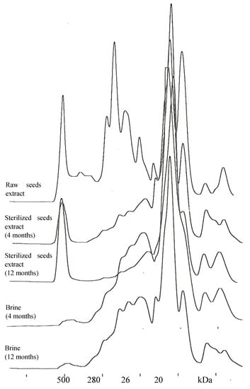 Separations of aqueous extracts conducted using SE-HPLC demonstrated changes in proteins induced by the sterilization process and storage in both seeds and brine (Figure 1). The extract from raw seed analyses demonstrated significant amounts of globulin 7S (180 kDa) and its subunit (50 kDa) [22,23]. Molecular weight of 7S proteins ranges from 150 to 200 kDa, depending on legume species [24]. High contents were also found in the case of the fraction with the molecular weight of 100 kDa (most likely albumin) and polymeric fractions with molecular weights exceeding 500 kDa. The 7S fraction was not detected in extracts prepared from sterilized seeds nor in the brine. Presumably, sterilization caused the formation of insoluble aggregates of the main storage protein in bean seeds. This resulted in a reduced solubility of nitrogen observed in our study. In turn, soluble fractions with a high molecular weight (>500 kDa) found in extracts from raw and sterilized seeds occurred in low amounts in the brine, which contained mainly fractions characterized by high solubility in water, corresponding to albumins. All extracts and brine showed a high content of the fractions with molecular weight <20 kDa, which confirms the high content of non-proteinaceous nitrogen compounds in their samples (Table 2).