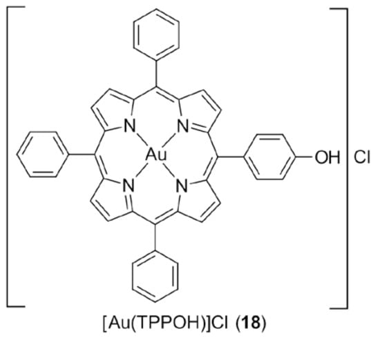The robust chelating ability of porphyrin ligands provides a rigid scaffold for its metal complexes and thus, it is not surprising that porphyrin is an excellent ligand for the formation of stable gold(III) complexes. Recently, Che and colleagues highlighted that the coupling of gold(III) with porphyrin ligands plays an essential role in the inhibition of HeLa cervical cancer cells (Hsp60) while other non-porphyrin gold(III) and platinum(II) porphyrin have complexes exhibited relatively poorer activities []. An important member of the series of gold(III) porphyrin complexes that were investigated, [Au(TPPOH)]Cl (18) (Figure 3), has been subjected to extensive, ongoing studies and has demonstrated remarkable stability under physiological (reducing) conditions. In terms of cytotoxicity, (18) exhibited better potency cf. cisplatin in vitro against a large panel of human cancer cell lines, including multi-drug resistant human oral epidermoid carcinoma (HSC-3), cisplatin-resistant nasopharyngeal carcinoma (HNE-1), hepatocellular carcinoma (HepG2), neuroblastoma (SH-SY5Y), colon carcinoma (HT-29), nasopharyngeal carcinoma (HK-1), and cisplatin-sensitive (A2780) and cisplatin-resistant (A2780cis) ovarian cancers cells, and, in vivo, it inhibited the tumour growth of mice bearing nasopharyngeal carcinoma (NPC) [,,,,,,,]. Further, work was directed to address the possible mechanisms behind therapeutic resistance encountered in neuroblastoma cells. The activation of protein kinase B (PKB), also known as Akt, by (18) before the onset of apoptosis was postulated as the key reason behind the induction of the encountered resistance []. This hypothesis was strengthened by the fact that the anti-cancer activity of (18) in neuroblastomas was enhanced after the introduction of Akt/protein kinase B signalling inhibitor (API-2). The study on gold(III) porphyrin complexes as putative anti-cancer agents was further extended to delineate the structure-activity relationship of these complexes against nasopharyngeal (SUNE1) cells []. Generally, gold(III) porphyrin derivatives with higher levels of lipophilicity were shown to give rise to enhanced cytotoxicity. It is also noteworthy that the anti-cancer efficacy of gold(III) porphyrin complexes can be heightened through their encapsulation within mesoporous silica nanoparticles [].