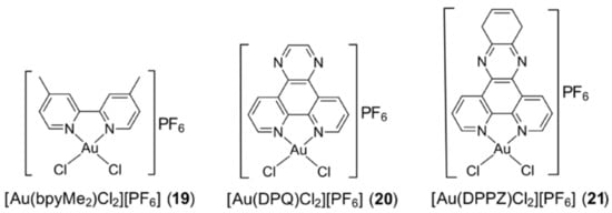 Gold(III) complexes bearing bipyridyl-type molecules have displayed promising anti-cancer properties as presented, for example, in the work by Casini et al. [] and Palanichamy et al. []. Three key exemplars based on substituted 2,2′-bipyridine (bpy), namely [Au(bpyMe2)Cl2][PF6] (19), [Au(DPQ)Cl2][PF6] (20) and [Au(DPPZ)Cl2][PF6] (21), are depicted in Figure 4. The cations were evaluated against, for example, the human ovarian carcinoma cell line (A2780) and the cisplatin-resistant variant (A2780cisR) (19); and human ovarian adenocarcinoma cells (A2780) and cisplatin-resistant ovarian cancer cells (A2780CP70) (20) and (21). The gold(III) complexes were proven to react with amino acids rather than nucleic acids, in contrast to cisplatin which is known to target nucleic acids []. Further, the gold(III) complexes induced apoptosis with lower cytotoxic effects exerted on normal non-cancerous cells, compared to that induced by cisplatin [].