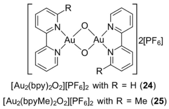 An alternative method to improve the cytotoxicity profile of gold(III) pyridyl derivatives is through the replacement of chloride ligands with bridging oxygen atoms within the bipyridyl-like ligand molecules, as exemplified for [Au2(bpy)2O2][PF6]2 (24) in Figure 5. Their anti-proliferative effects were evaluated against three human tumour cell lines—breast cancer (MCF-7), cervical cancer (HeLa) and hepatic carcinoma (HepG2)—and three non-tumorigenic cell lines—human renal cortical epithelial (HRCE), human keratinocyte (HaCaT) and rat cardiomyoblast (H9c2). A reduced toxicity effect was exerted on the non-tumorigenic cell lines [,]. Referring to Figure 5, the derivative with R = Me (25) was encapsulated in an apoprotein-based ferritin that did not contain iron, with a protein:gold ratio of 75:1, and the resultant species was tested on the same cells as above. The MTT assay revealed that the encapsulated species exhibited reduced cytotoxicity towards cancerous cells (e.g., a two-fold reduction in potency against HepG2) but had significantly reduced toxicity towards normal HRCE, HaCaT and H9c2 cells as compared to the original molecule, by nearly 30-, five- and 15-fold, respectively [].