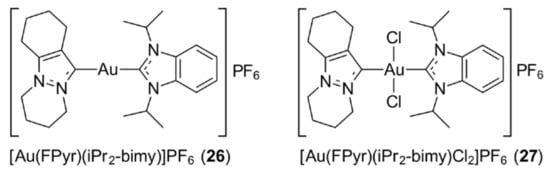 Chemical structures of (26) and (27). Abbreviations: FPyr is 1,3-diisopropylbenzimidazolin-2-ylidene and iPr2-bimy is 1,2,3,4,6,7,8,9-octahydropyridazino[1,2-a]indazolin-11-ylidene.