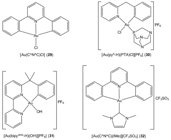 Cyclometallation contributes to the stability of gold(III) complexes through the coordination of a ring-carbon atom within a chelating ligand which results in the formation of a strong covalent Au‒C bond. Che and co-workers reported mono-, bi- and tri-nuclear cyclometallated gold(III) complexes with the general formula [Aum(C^N^C)mL]n+, where L is chloride or a neutral ligand, such as phosphane and pyridine [] (see Figure 7 for the chemical structure of the prototype complex, [Au(C^N^C)Cl] (28)). These complexes possess promising stability with no evidence of demetallation upon treatment with glutathione. Further, it has been proposed that the [Au(C^N^C)]+ moieties enhance the stability of the gold–phosphane ligand, paving the way for the possibility for [Au(C^N^C)]+ to function as a carrier for biologically active molecules such as phosphane []. Owing to the prominent in vitro cytotoxicity originally reported for [(μ-dppp)Au2(C^N^C)2](CF3SO3)2 (29) [], this complex was revisited seven years later together with other binuclear derivatives for the assessment of anti-tumour efficacy in a nude mice model bearing human hepatocellular carcinoma (PLC) cells [] (dppp is 1,2-bis(diphenylphosphino)propane, Ph2P(CH2)3PPh2). In that study, it was discovered that the nature of the bridging phosphane ligand influenced the compound’s potency. The binuclear cyclometallated gold(III) complex bridged by a dppp showed the greatest anti-cancer properties among the series, while changing of the bridging linker resulted in reduced efficacy. This particular dimeric complex also demonstrated better cytotoxic activity compared to the monomeric derivative and other related compounds with the phosphane ligand replaced by carbene substituents. The crucial role of phosphane ligand in enhancing in vitro toxicity was further demonstrated by the presentation of the most prominent toxicity profile among the derivatives by [Au(pyb-H)(PTA)Cl][PF6] (30) (Figure 7) []. Different studies have revealed that both cyclometallated gold(III) complexes with C^N- and C^N^N-type ligands, e.g., [Au(bpydmb-H)(OH)][PF6] (31), (Figure 7) exhibit enhanced stability under physiological conditions compared to those coordinated by N-donor ligands and that this stability accounts for their reactivity towards nucleobases []. As reported by Che and colleagues, the incorporation of N-heterocyclic carbenes into cyclometallated C^N^C gold(III) complexes imparts stabilisation and improves solubility. In addition to the above, the screening of the in vivo anti-cancer properties of the [Au(C^N^C)(IMe)][CF3SO3] (32) complex (Figure 7) in a nude mice bearing hepatocellular carcinoma (PLC) resulted in significant tumour size reduction with no apparent toxic side effects [].