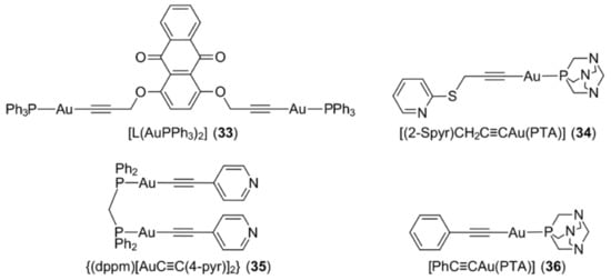 Alkynyl ligands with a triply bonded di-carbon (‒C≡C‒) fragment, coordinate gold(I) to form organogold(I) compounds featuring an Au–C bond. Knowledge of the biological properties of this type of organogold(I) compound remains relatively scarce but the revealed promising anti-cancer properties ensure continued investigation. Mono- and di-gold(I) triphenylphosphane complexes derived from 1,4-, and 1,8-dialkynyloxyanthraquinones have been found to possess cytotoxicity against four cancer cell lines, namely, breast adenocarcinoma (MCF7), lung adenocarcinoma (A549), prostate adenocarcinoma (PC3) and colon adenocarcinoma (LOVO) [] (see Figure 8 for an exemplar of a binuclear complex, i.e., [L(AuPPh3)2] (33)). These compounds were shown to exhibit greater toxicity towards MCF7 cancer cells which have a greater mitochondrial mass and thus, it was proposed that mitochondria are the key intracellular target. In a different study, a series of gold(I) alkynyl compounds functionalised with thiopyridine-type substituents and with water soluble 1,3,5-triaza-7-phosphaadamantane (PTA), e.g., [(2-Spyr)CH2C≡CAu(PTA)] (34) (Figure 8), induced apoptosis in human colon cancer cell lines (Caco-2: PD7 and TC7 clones) as well as moderately inhibiting the tumour growth in athymic (i.e., lacking a thymus gland) nude mice, with no significant toxicity observed in the organs (kidney and liver) []. It is noteworthy that these complexes could possibly induce cytotoxicity by acting as pro-drugs, as time-dependent spectroscopy showed their progressive transformation (aquation) in physiological medium. Generally, high lipophilicity often correlates with poor solubility and therefore, hampers the biological properties of gold-based drugs. This generalisation holds true in the case of phosphane-bridged binuclear gold(I) alkynyl compounds [], e.g., {(dppm)[AuC≡C(4-pyr)]2} (35) (Figure 8), but not so in gold(I) alkynyl compounds, such as [PhC≡CAu(PTA)] (36) [,], Figure 8. The latter results highlight the importance of the presence of reasonable lipophilicity to enable the transportation of gold(I) alkynyl compounds in blood.