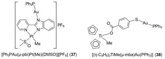The significant toxic side effects and cancer resistance associated with cisplatin and second generation platinum drugs coupled with the sometimes poor stability of gold compounds in the physiological environment, have prompted various strategies aimed at improving the efficacy of metal-based drugs. One of the alternatives includes designing compounds bearing two or more metal centres to exploit possible synergistic effects out of the combination. Recently, the incorporation of a [Ph3PAu]+ moiety into a platinum complex resulted in the formation of [Ph3PAu(μ-pbi)Pt(Me)(DMSO)][PF6] (37) (Figure 9) which showed improved anti-proliferative effects against the cisplatin-sensitive (A2780/S) and cisplatin-resistant (A2780/R) human ovarian cancer cell lines []. However, additional tests were performed, with the results suggesting that the heterobimetallic complex in fact simply manifested an additive effect rather than producing a synergistic effect. The anticipated synergistic effect for heterobimetallic complexes was observed in several gold(I)–ruthenium(II) and gold(I)–titanium(IV) complexes [,,,,,]. It is worth highlighting that these heterobimetallic complexes, in general, exhibited enhanced cytotoxic effects with improved stability and solubility, while being more selective towards cancer cells and less toxic to non-tumorigenic human cell lines. An in vivo study performed on [(η-C5H5)2TiMe(μ-mba)Au(PPh3)] (38) (Figure 9) in Caki-1 xenografted mice further supported the synergism of heterobimetallic strategy, i.e., impressive tumour shrinkage without significant side effects []. Gold nanoparticles (GNPs) on the other hand offer a safe and promising delivery scaffold for anti-cancer drugs, but as the focus of this review is molecular gold compounds, the details of GNPs will not be discussed here [,,]. Suffice to mention that, in general, several factors account for the effectiveness of GNPs for drug delivery, including pH and shape [,], and GNPs not only function as drug carriers, they can also play a crucial role in mediating anti-cancer activity [,].