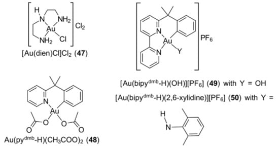 In contrast, gold(III) congeners have been less explored in this context. Despite being reported, in 1998, that gold(III) complexes require a 1000-fold higher concentration than gold(I) drugs to yield inhibition effects on TrxR [], several gold(III) complexes (i.e., [Au(dien)Cl]Cl2 (47), Au(pydmb-H)(CH3COO)2 (48), [Au(bpydmb-H)(OH)][PF6] (49) and [Au(bpydmb-H)(2,6-xylidine)][PF6] (50); Figure 11) have displayed promising inhibitory dosages in the micromolar range, while Au(S2CNMe2)X2 (40) and Au[S2CN(Me)CH2C(=O)OEt]X2 (41), X = Cl and Br, have shown inhibition of TrxR at nanomolar concentrations [,,]. The inhibitory potency of gold compounds is largely influenced by the oxidation state of their metal centres and the lability of coordinated ligand(s). Gold(III), being a ‘hard’ metal (cf. gold(I)), presents a relatively lower probability for coordination with the selenocysteine active site of TrxR [,,].