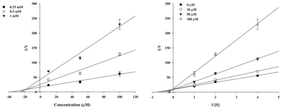 Kinetic analysis was employed to verify the inhibitory activity of the active compounds and identify the type of inhibition. KG and MG were potent tyrosinase inhibitors as analyzed by Lineweaver–Burk and Dixon plots (Figure 3 and Figure 4). Different concentrations of the substrate (l-tyrosine, 1.0, 0.5, and 0.25 mM) along with the various concentrations of KG (10, 50, and 100 µM) and MG (1.6, 8, and 40 µM) were analyzed. The lines of the Dixon plot intersected the y-intercept, which indicated competitive inhibition of tyrosinase with Ki values of 18.66 and 5.19, respectively, for KG and MG (Table 1). The Ki values represent the concentrations required to form an enzyme inhibitor complex, so inhibitors with lower Ki values indicate greater tyrosinase inhibition activity for the development of prophylactic and therapeutic agents.