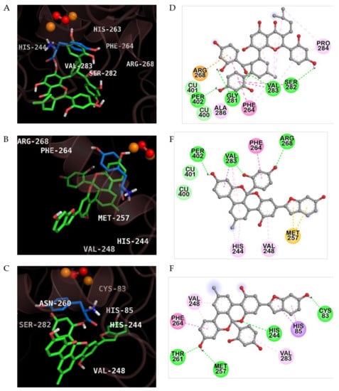 Inhibition mode of kuwanon G (A), mulberrofuran G (B), and albanol B (C) for the oxy-form mushroom tyrosinase catalytic site with l-tyrosine (blue stick). Two copper ions and peroxide ions are represented as orange and red spheres, respectively. Tested inhibitors are represented in green stick. 2D diagram of tyrosinase inhibition by kuwanon G (D), mulberrofuran G (E), and albanol B (F).