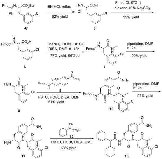 The asymmetric α-alkylation of glycine Schiff base with substituted benzyl bromides can be applied to the synthesis of new derivatives of CPD-15A5 as allosteric antagonists for the β2AR, such as (2S)-3-(3-chlorophenyl)-2-((2S)-2-(2-cyclohexyl-2-phenylacetamido)-3-phenylpropanamido)-N-methylpropanamide (13, Scheme 1). (S)-tert-Butyl N-(diphenylmethylene)-(3-chlorophenyl)alaninate (4j’) was hydrolyzed in refluxing hydrochloric acid to give (S)-3-chlorophenylalanine hydrochloride (5) in 92% yield, and then the amino group in 5 was protected with Fmoc-Cl, affording Fmoc-protected (S)-(3-chloro)phenylalanine (6). In the next step, the Fmoc-protected l-phenylalanine methylamide 7 was obtained by condensation of 6 with methylamine in the presence of O-benzo-triazol-1-yl-N,N,N′,N′-tetramethyluronium hexafluorophosphate (HBTU) and hydroxybenzotriazole (HOBt). It should be pointed out that the acidic hydrolysis of 4j’ didn’t racemize the amino acid, because the ee value of 7 is 96%. After Fmoc deprotection of 7 (piperidine/DMF), the resulting l-phenylalanine methylamide 8 was coupled in the presence of HBTU/HOBt with Fmoc-l-4-carbamoylphenylanine (9) to generate dipeptide 10 in 51% yield. Upon treatment with piperidine in DMF, the Fmoc group in 10 was removed smoothly at room temperature, giving the corresponding amine 11 in 95% yield. In the final step, 11 was reacted with 2-cyclohexyl-2-phenyl acetic acid (12) to afford the desired product 13 in 63% yield.