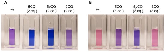Figure 1 shows the photos of reproduction experiments that mixed 1 (0.1 mM) and 1 eq. of Al3+ with 2 eq. of co-pigment (2–4) in buffer solutions at pH 4.0 (Panel A) and pH 3.2 (Panel B). At pH 4.0, a mixture of 1 and Al3+ without co-pigment exhibited a purple color, but the addition of 5CQ (2) or 5pCQ (3) gave blue solutions (Figure 1A). Contrasting with 5-O-acylquinic acids, 3CQ (4) gave a purple solution (Figure 1A). At pH 3.2, the solution of 1 with 1 eq. of Al3+ exhibited a red color. Two equivalents of 5CQ (2) gave a purple solution, and the addition of 2 eq. of 5pCQ (3) color led to a solution that became bluer than that of 5CQ. The solution with 3CQ showed a red solution similar to that without co-pigment (Figure 1B). Those results were the same as in our previous reproduction experiment in buffers with higher concentration.