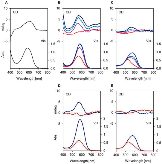 After Vis and CD measurements, all samples were frozen and stored at −20 °C until mass analysis. The frozen samples were quickly melted under r.t., and the sample solutions were filtered using a cartridge filter (cellulose acetate, pore size: 0.45 μm, Toyo Roshi). These sample solutions were injected directly by syringe pump (flow rate: 180 µL/hr, KDS-100-CE (KD Scientific Inc., Holliston, MA, USA) without adding any flow-solvent. Electrospray ionization-time of flight mass spectrometry (ESI-TOF-Mass) analysis was performed using a micrOTOF-QII mass spectrometer (Bruker, Billerica, MA, USA) and analyzed using the included software. Mass measurement was performed over the mass range (m/z) from 100 to 3500. HR-MS was recorded by micrOTOF-QII, and calibration was performed with TuneMIX (Agilent Technologies, Santa Clara, CA, USA). The collision energy of the MS/MS analysis was set at 20 eV (positive detection) or 30 eV (negative detection).