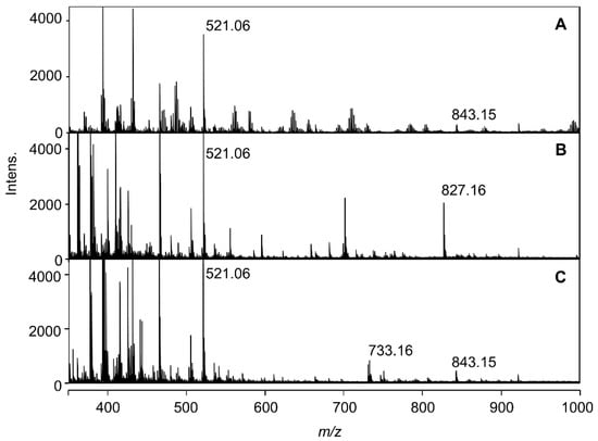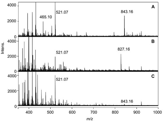 Using the reproduced blue solution in very low-concentration buffered solution (2 mM), the ESI-TOF-Mass spectra were measured. In Figure 3, the mass spectra of the solutions mixed with Dp3G (1, 0.1 mM), co-pigment (2 eq.) and Al3+ (1 eq.) at pH 4.0 are shown. With positive-ion mode detection, the blue solution mixed with 5CQ gave a molecular ion peak at m/z = 843.16 (Figure 3A). With negative-ion mode detection, the same solution gave a molecular ion peak at m/z = 841.14 (Figure S3A). Using high-resolution mass analysis (HR-MS), the molecular formula was determined to be C37H35O21Al (Figure S4A,B), suggesting that the ion is composed of 1:1:1 of Dp3G (1), 5CQ (2) and Al. When a blue solution obtained by the addition of 5pCQ (3) was measured, the molecular ion peak was shifted to m/z = 827.16 (Figure 3B), and with negative-mode detection, the molecular ion was observed at m/z = 825.14 (Figure S3B). HR-MS analysis gave the molecular formula as C37H35O20Al (Figure S4C,D). However, the reddish-purple solution obtained by 3CQ (4) gave a very small peak at m/z = 843.16 (Figure 3C). All three spectra showed an ion peak at m/z = 521.07 attributable to Dp3G (1, Figure 3). In the buffered solutions and/or during ionization, formation of pseudobase from Dp3G (1) by hydration followed by addition of potassium ion gave a pseudobase-potassium ion at m/z = 521.07 (calcd for C21H22KO13 [Dp3G + OH + K]+ 521.07). Potassium ion is known to be easily contaminated from calibration solution of pH meter.