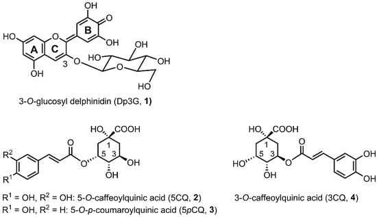 Dp3G (1) was purified from the seed coat of the scarlet bean, Phaseolus coccineus, according to our procedure [17]. The co-pigments 5CQ (2) and 5pCQ (3) were synthesized [17,22], and 3CQ (2) was purchased from WAKO. Formate buffer (pH 3.2) was prepared by mixing 5 mM formic acid (diluting of 88% Formic acid, WAKO, Osaka, Japan) and 5 mM sodium formate (dissolving of sodium formate, WAKO). Acetate buffer (pH 4.0) was prepared by mixing 5 mM acetic acid (diluting of 99% acetic acid, WAKO) and 5 mM sodium acetate (dissolving of sodium acetate, WAKO). Then, 1 mM aluminum solutions were prepared with AlCl3·12H2O (Kanto Kagaku, Tokyo, Japan) by dissolution in distilled water.