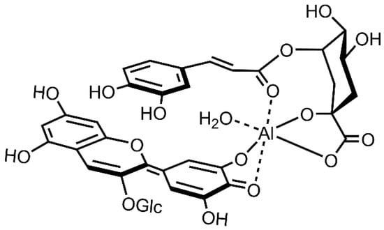 - Takeda, K.; Yamashita, T.; Takahashi, A.; Timberlake, C.F. Stable blue complexes of anthocyanin-aluminium-3-p-coumaroyl- or 3-caffeoyl-quinic acid involved in the blueing of Hydrangea flower. Phytochemistry 1990, 29, 1089–1091. [Google Scholar] [CrossRef]