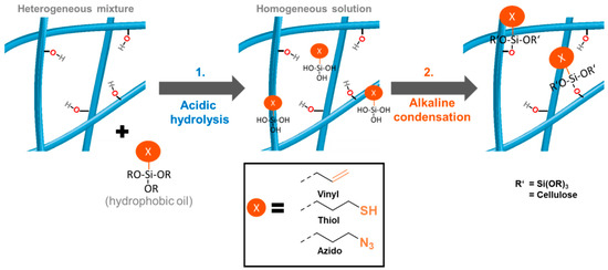 Conventional silane modification is conducted as schematically shown in Figure 1, left. First, the alkoxysilane is pre-hydrolyzed in an acetone/water (or alcohol/water) mixture. Meanwhile, the cellulose is solvent-exchanged to the same solvent and the hydrolyzed silanol species is added, allowing it to adsorb onto the cellulose surface. In the final step, the sample is cured to remove water and to condense the silanol with the substrate’s surface hydroxyl groups, and this way it establishes covalent linkages. This is usually the critical step, since the curing causes hornification and induces also crosslinking reactions by the trivalent silanol.