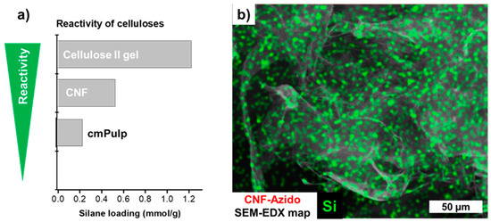 (a) Reactivity order of different cellulosic substrates towards 3-azidopropyl triethoxysilane. The reactivity and therefore the resulting silane loading of the nanocelluloses, cellulose nanofibrils (CNF) and cellulose II gel (LG), was significantly higher than the one of the carboxymethylated pulp (cmPulp). (b) The homogeneous distribution of the silane is shown by SEM-EDX (example: azido-functionalized CNF).