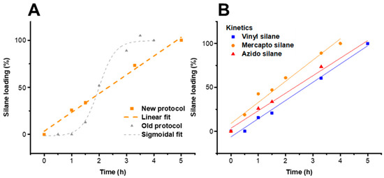 (A) Comparison of silanization kinetics of cellulose II gel with 3-azidopropyl triethoxysilane between novel approach and conventional literature procedure [6]. The kinetics of the two-step procedure (hydrolysis and condensation) have a linear fit (zero-order) instead of the previous sigmoidal fit. (B) Kinetics of the different silanization agents used in this work (substrate cellulose II gel), with the reactivity of the silanes increasing in the order vinyl, azido and mercapto silane.
