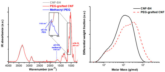 Thiol-ene grafting of methylacryl poly(ethylene glycol) (PEG) onto a cellulose nanofibril surface, IR spectrum (left) and the gel permeation chromatography (GPC, right).