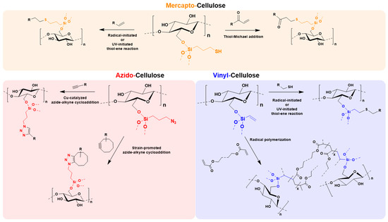 As shown in Figure 8, the obtained materials are useful in a variety of different click chemistry [36] approaches, among others radically or UV-induced thiol-ene processes [10,28,37], thiol-Michael reactions [29], photo-induced thiol-yne reactions [38], copper-catalyzed azide-alkyne cycloadditions [6,39,40], or strain-promoted and copper-free azide-alkyne cycloadditions [41,42]. Especially with relation to biomedical application, the mercapto, and azido silanes can be used in biorthogonal conjugations [43] by spontaneous reactions without the need of catalysts or heat, such as thiol-maleimide [44] or copper-free azide-alkyne click chemistry. Vinyl-functionalized celluloses have a great potential in 3D-printing with photocurable acrylate resins [45,46]. These few examples are just given to demonstrate the great application potential of the cellulose-modification toolbox.