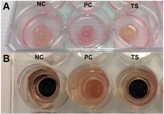 The view of 3D reconstructed human skin inserts during in vitro skin irritation evaluation before (A) and after (B) cell viability test after 18 h of incubation. NC—negative control (distilled water); PC—positive control (1% Triton X-100); TS—test sample (multiple emulsion).