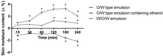 Water plays a crucial role in respect to the normal function of the epidermal barrier and mechanical properties of the skin. Stratum corneum water content is therefore of particular interest in most topically applied cosmetics and pharmaceutics [37]. When evaluating the short-term (240 min) skin-moisturizing effect of emulsion systems, the skin moisture significantly changed after 0 to 240 min of product application depending on the emulsion system that had been used (Figure 2).