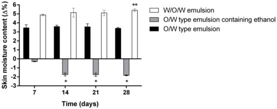 The influence of the investigated emulsions on the skin moisture within 28 days. * p < 0.01 vs. O/W emulsion and W/O/W emulsion; ** p < 0.01 vs. 7 days. N = 42 volunteers.