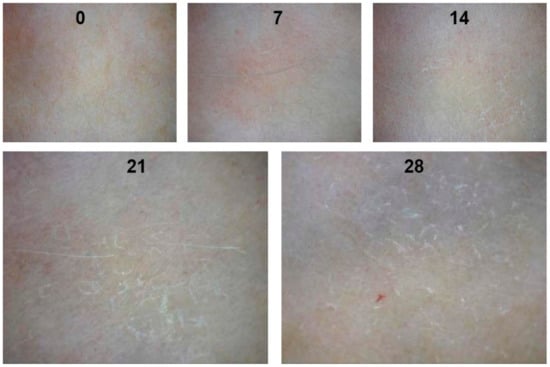 Approximately 300 µL of the sample was applied to a 5 cm2 skin area of the inner forearm. The obtained data were analyzed using “Skinsys” software. Determination of the hydration state of stratum corneum is generally based on electrical measurements on the skin surface based on the capacitance method [37]. Skin moisture content was determined using a corneometer MY808S (Scalar, Tokyo, Japan): the head of corneometer was pressed to the skin and held for 2–3 s.