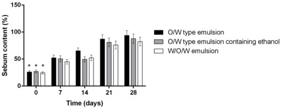 The amount of sebum at the surface of the skin increased significantly after 7 days of daily use of the tested emulsion systems. In the biomedical trial it was determined that the lipid content of the skin after 28 days of daily use of multiple emulsion was 6.76% higher than the O/W emulsion and 13.28% higher than O/W emulsion containing ethanol (p < 0.01). We hypothesized that such effect could occur due to the presence of alcohol in the emulsion system, though Kramer et al. have determined that daily use of disinfectants containing more than 60% of alcohol has no significant effect on superficial sebum content [45]. Yet according to Ahtar et al., sebum content in the skin depends only on the lipophilic phase concentration in the emulsion system [46]. Based on the data presented in Figure 3 and Figure 5 the direct correlation between the moisture and sebum content was determined (corr. coefficient 0,897).