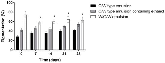 The influence of the investigated emulsions on the skin pigmentation * p < 0.01 vs. 0 days. N = 42 volunteers.