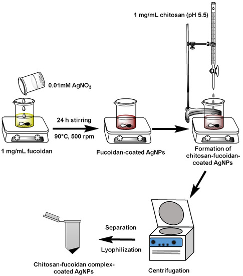 Figure 1 shows the schematic for the fabrication of chitosan–fucoidan-coated AgNPs. First, fucoidan was mixed with silver nitrate (AgNO3) solution to form AgNPs. Fucoidan was used as capping agents as well as reducing agents for the formation of stable AgNPs [43]. Then, chitosan was added to the fucoidan-coated AgNPs to form stable AgNPs coated with chitosan–fucoidan polyelectrolyte complexes. Centrifugation was used to remove the residual AgNO3, free chitosan, and fucoidan from the chitosan–fucoidan complex-coated AgNPs. The final product was obtained by lyophilization.