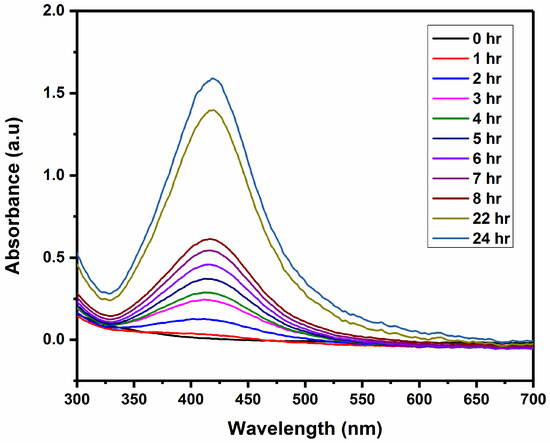 In a previous study, AgNPs were prepared by using fucan of Spatoglossum schröederi brown seaweed [44]. According to that study, fucan reduces the silver ions to form the stable fucan-coated AgNPs [44]. In this study, Fucus vesiculosus brown seaweed-derived fucoidan was utilized to prepare AgNPs. Fucoidan from Fucus vesiculosus has been utilized for anticancer therapy [45]. UV-Vis spectroscopy of fucoidan-coated nanoparticles was obtained at different time intervals. Figure 2 shows the UV-Vis spectrum of biosynthesized AgNPs at different time intervals. As shown in Figure 2, during the first hour, AgNPs were not formed. However, surface plasmon resonance (SPR) peak of AgNPs at 418 nm was observed after 2 h of reaction, and the intensity increased with time. The maximum intensity of the SPR peak was observed after 24 h of interaction of fucoidan with silver ions.