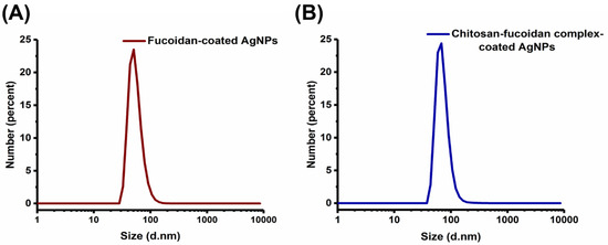Size of (A) fucoidan-coated AgNPs and (B) chitosan–fucoidan complex-coated AgNPs.