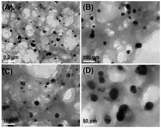 Transmission electron microscopy (TEM) images of chitosan–fucoidan complex-coated AgNPs at different magnifications (A) 0.2 µm, (B,C) 100 nm, and (D) 50 nm.